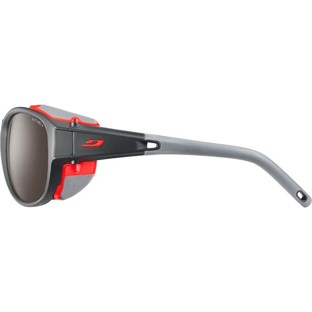 Die Expl*** 2.0 Alti Arc 4 von Julbo wurde für lange Touren im Hochgebirge entworfen. Diese zuverlässige Gletscherbrille wird selbst höchsten Anforderungen gerecht. Durch die verbesserte Ergonomie drückt diese Brille auch nach langem Tragen nicht. Das schlanke und stylische Design sorgt für einen guten Sitz, die abnehmbaren Seitenteile schützen vor seitlicher Sonneneinstrahlung. Die großen, gewölbten Gläser ermöglichen darüber hinaus eine gute Panoramasicht und schützen die Augen vor schädlicher Strahlung. Die mineralischen Gläser gehören der Schutzkategorie 4 an und sind somit optimal für das Hochgebirge sowie Eis und Schnee geeignet. Durch die Antireflexbeschichtung sowie die Flash-Behandlung wird die Filterwirkung des Glases nochmals erhöht. Das robuste und unempfindliche Material wirkt außerdem der Bildung von Kratzern entgegen.